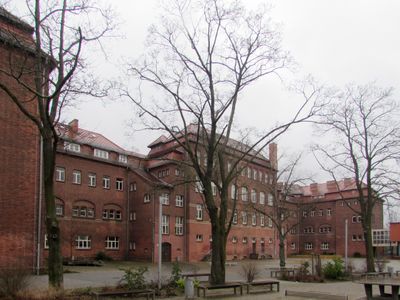 Das Von Saldern-Gymnasium befindet sich in einem roten Backsteingebäude im historistischen Stil mit traditionellen germanischen Architekturelementen im Stadtteil Neustadt.