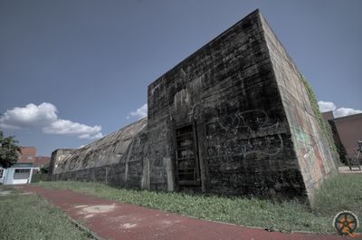 Der Stahlbetonbunker steht neben der Friedrich-Ebert-Schule mit dicken Wänden und gewölbter Decke gegen Luftangriffe.