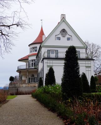 Villa Maffei ist ein zweiflugeliges Gebäude mit asymmetrischer Form, das sich an der Seestraße 4 in Feldafing befindet. Die Architektur zeigt Merkmale wie einen runden Turm, Erkerblöcke an den Ecken und breite Balkone, die sich zur Seesee hin öffnen.