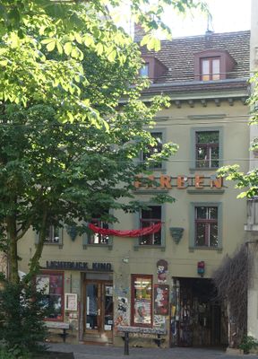 Das Gebäude zeigt aufwändige Ornamente wie Rosetten unter den Fenstervordächern und geschwungene Schlüsselsteine, die zeigen, dass es einst für wohlhabendere Bewohner erbaut wurde. Diese handwerklichen Details kontrastieren interessant mit seiner heutigen Nutzung als Künstlerraum und Werkstättengebäude.