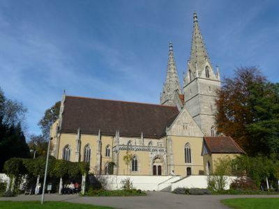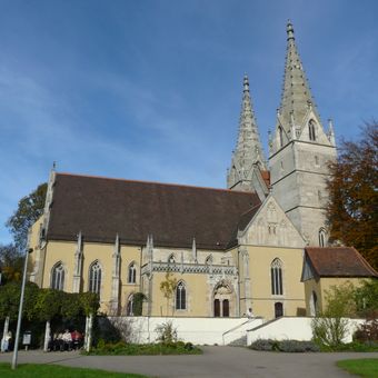 Das Gebäude der Oberhofenkirche zeigt traditionelle deutsche Kirchenarchitektur mit ihrer Steinkonstruktion, hohen Fenstern und dem zentralen Glockenturm.