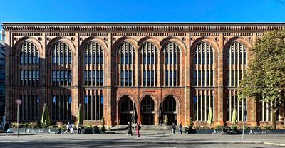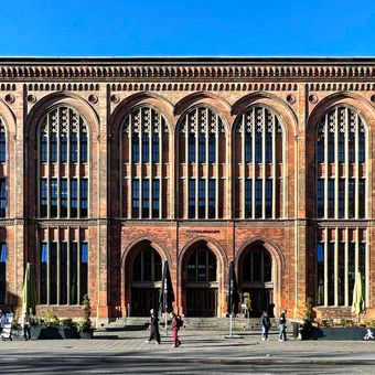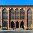 Das Backsteingebäude in der Sonnenstraße 26 zeigt hohe Spitzbogenfenster und eine im Maximilianstil gestaltete Fassade.