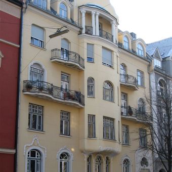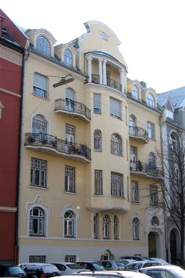 Mietshaus, viergeschossiger Satteldachbau mit Polygonalerker, Zwerchhaus mit geschweiftem Giebel, Balkonen und reichem Putzdekor, 1907–1908 von Adolf Wentzel.