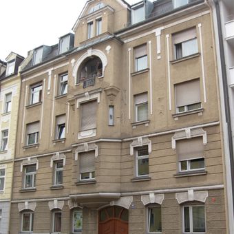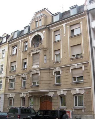Mietshaus, viergeschossiger Bau mit Erker, Loggia und Zwerchhaus, errichtet in den Formen des barockisierenden Jugendstils, von Georg Guinin, 1905/1906. Nach Kriegsschäden teilerneuert und hofseitig Geschosserhöhung; bildet mit Georgenstraße 112 und 114 eine