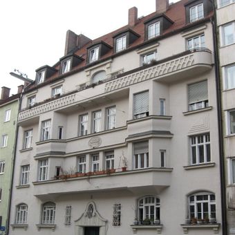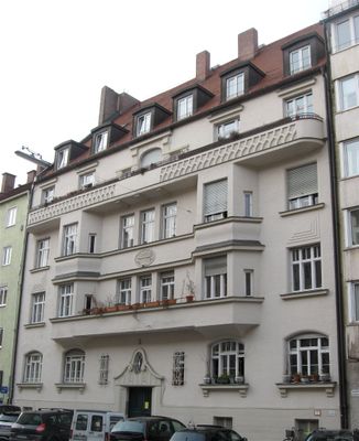 Mietshaus, viergeschossiger Jugendstilbau, mit von zwei Erkern getragenem Längsbalkon, von Otho Orlando Kurz und Eduard Herbert, 1909. Nach Kriegsschäden Wiederherstellung durch Franz Ruf 1946.