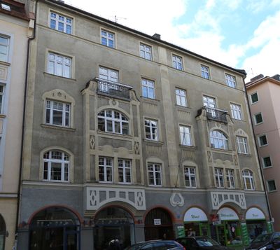 Mietshaus, fünfgeschossiger Jugendstilbau mit Doppelerkerfassade und Putzdekor, 1912 von Josef Heldmann (Architekt), wohl später aufgestockt.
