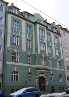 Mietshaus, viergeschossiger historisierender Mansarddachbau mit Putzgliederung und durch Erker sowie Zwerhaus betonter Eingangsachse, um 1900.