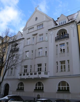 Mietshaus, viergeschossiger Satteldachbau mit großem Zwerchhaus, flachen Polygonalerkern, Balkongittern und reicher Putzgliederung, in Formen des späten Jugendstils, um 1909 von Heinrich Stengel und Paul Hofer (Architekt).