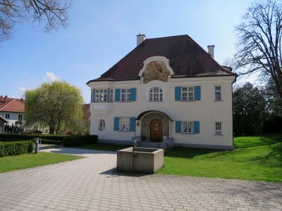 Pfarrhaus, villenartiger zweigeschossiger Bau mit Walmdach, Schweifgiebel und Eckerker, im barockisierenden Jugendstil, bezeichnet mit 1912