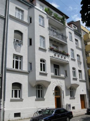Mietshaus, viergeschossiger Jugendstilbau mit Mansarddach, breitem Dachhaus und zwischen Erkern eingespannten Balkonen, Stuckzier, 1911 von Adolf Wentzel.