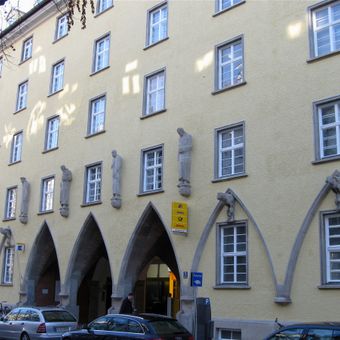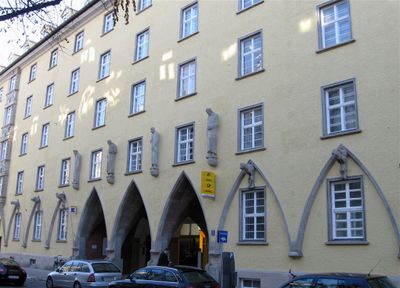 Agnespost, fünfgeschossiger Walmdachblock mit Anklängen an den Expressionismus und reichem Steinfigurenschmuck, 1925/26 von Robert Vorhoelzer und Franz Holzhammer; mit Isabellastraße 16.