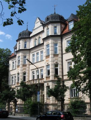 Mietshaus, deutsche Renaissance, reich gegliedert, 1895 von Hans Weber.