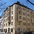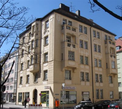 Mietshaus in Ecklage, fünfgeschossiger Jugendstilbau mit Erkern, von Michael Heitzer, 1904, nach Schäden im Zweiter Weltkrieg mit vereinfachter Dachzone wiederhergestellt.