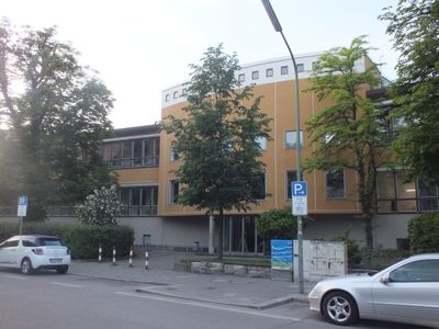 Hörsaalgebäude des Physiologischen Instituts der Ludwig-Maximilian-Universität, stahlbetonskelettbau, dreiteilig gegliederter Trakt, dessen ungleich lange, zweigeschossige und durch hohe Fensterbänder belichteten Seitenflügel einen sich leicht vorwölbenden Mittelrisalit von flächiger Front flankieren; über der großzügigen