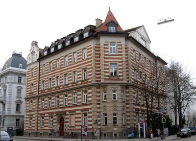 Mietshaus, neurenaissance, in farbigen Backsteinschichten, mit Eckerker, 1889 (Dachzone reduziert).
