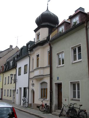 Zweigeschossiges Kleinhaus, neorenaissance mit Zwiebeltürmchen, bez. 1889; in einer Reihe mit Nr. 9, 11, 13, 17, 19 und 21.