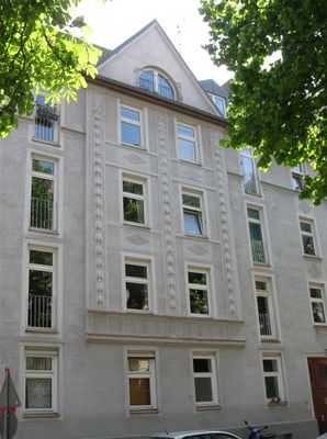 Mietshaus, viergeschossiger, traufseitiger Satteldachbau mit Zwerchgiebel und Flacherker, historisierend, Anfang 20. Jahrhundert.