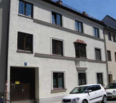 Dreigeschossiges Traufhaus, dreigeschossiger Traufseitbau mit Satteldach und Flacherker, einfache Putzfassade mit Sohlbankgesimsen, 1875.