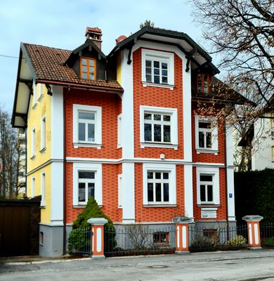 Vorstadthaus, zweigeschossiger putzgegliederter Flachsatteldachbau in historisierenden Formen mit Schopfwalmdach-Risalit, um 1900