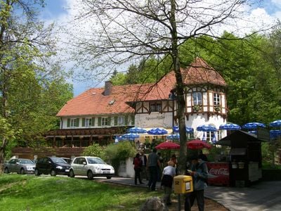 Burggaststätte Neuschwanstein, Jugendstilbau mit Bauteilen, die für Neuschwanstein bestimmt waren, z. B. Säule am Vordach des Eingangs.