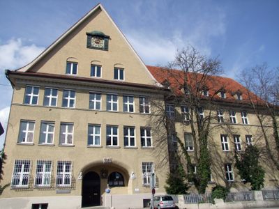 Sebastian-Lotzer-Realschule, städtische Realschule, auf winkelförmigem Grundriss zwei dreigeschossige Flügelbauten, mit Satteldach bzw. abgewalmtem Dach, rückseitig Aula mit gedecktem Verbindungsgang, in reduziert-historisierenden Formen, 1910/11 von Architekten Heydecker