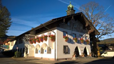 Rathaus, zweigeschossiger Flachsatteldachbau mit Dachreiter, offenen Erdgeschossarkaden, südseitiger Altane und Fassadenmalereien, im reduzierten Heimatstil, 1930/31 von Hermann Lang, 1979/80 westliche Erweiterung