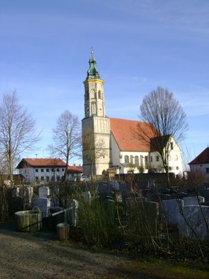 Katholische Pfarrkirche Maria Himmelfahrt und St. Margareta, ehemals Wallfahrtskirche zu den Vierzehn Nothelfern, als dreischiffige Halle 1403-06 erbaut, Umgestaltung zur Wandpfeileranlage und Chorneubau 1751/53 durch Franz Alois Mayr, Westturm spätgotisch, 1403, Obergeschoss 1756/59; mit Kirchenausstattung;