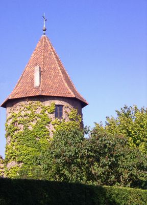Lindenturm, Rundturm im Zug der Stadtmauer, verputzter Sandsteinquaderbau mit Kegeldach, im Kern (Untergeschoss) wohl romanisch, weitgehend erneuert 1894 und 1954
