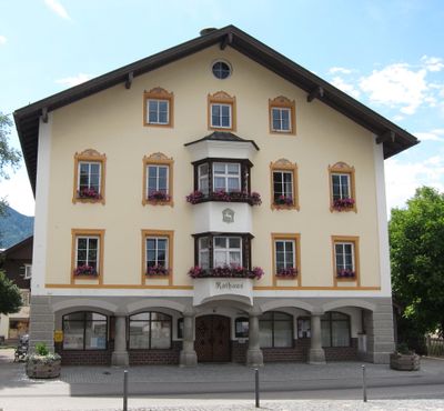 Rathaus, dreigeschossiger putzgegliederter Flachsatteldachbau in Ecklage mit erdgeschossigem Laubengang und mittigem Polygonalerker, im Kern 1881.