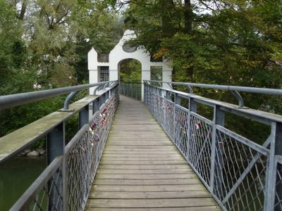 Eisensteg über die Amper, sogenannter Silbersteg, um 1900, neubarocker Torbogen und Figur des Hl. Johann Nepomuk von 1902