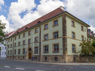 Vermessungsamt Kronach, zweiflügeliger Komplex mit dreigeschossigem Walmdachbau und zweigeschossigem Mansardwalmdachbau, mit Sandsteingliederung, bezeichnet „1924/25“