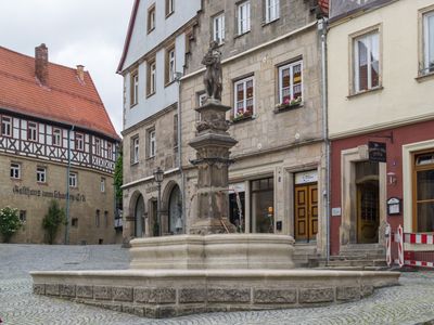 Johannesbrunnen, sandstein, Brunnenkasten 1595, zweistufiger Brunnenpfeiler und Figur 1672 von Hans Philipp Langenhan