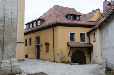 Wohngebäude, zweigeschossiger, spitzwinkliger Walmdachbau mit Rundbogenportal, im Kern 17./18. Jahrhundert
