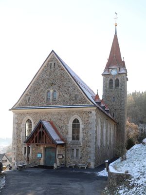 St. Pankratius, Saalkirche, Bruchsteinbau mit Satteldach, Chorseitenturm mit Spitzhelm, Sakristeianbau, neugotisch, 1911–13 von Gustav Haeberle; mit Ausstattung