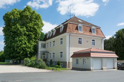 Fabrikantenvilla, zweigeschossiger Mansardwalmdachbau, bezeichnet „1909“, von Architekt Stölzel, Kronach; Einfriedung, Steinpfosten und Metallgitterzaun
