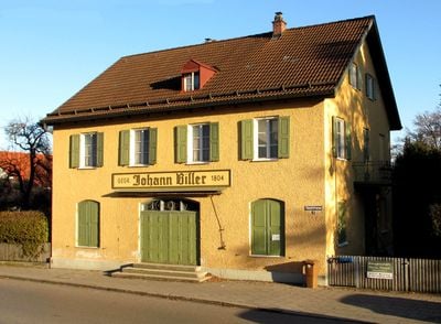 Das Kaufhaus Biller ist ein zweigeschossiges Wohnhaus mit einem Handelsbetrieb in Starnberg, das eine klassische Shopfront und ein dekoratives Dachwerk aufweist. Die Fassade bewahrt Originalelemente wie Fensterrahmen und Eingangstreppe, während der Grundriss noch heute die typische Anordnung von Wohnraum oben und Laden unten zeigt.