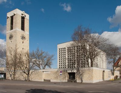 St. Joseph, katholische Pfarrkirche und Gemeindezentrum, 1961–63 von Josef Elfinger, Betonständerkonstruktionen mit Ausfachung in Jura-Kalkstein: Kirchenbau von basilikalem Querschnitt mit hallenartigem, zwischen zwei Stahlbeton- Rahmenbinder eingespanntem Mi