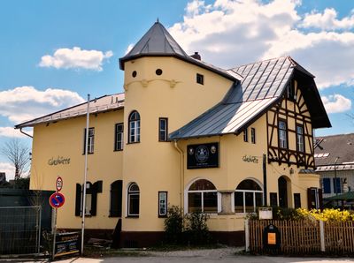 Gasthaus, zweigeschossiger Schopfwalmdachbau in heimatstiligen Formen mit Erkerturm und Zierfachwerk, um 1900.