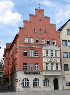 Sparkasse und Wohnhaus, viergeschossiger Steildachbau mit Treppengiebel und zweigeschossigem Kastenerker, in modern-historisierenden und expressionistischen Formen von Franz Schwäbl, 1925.
