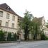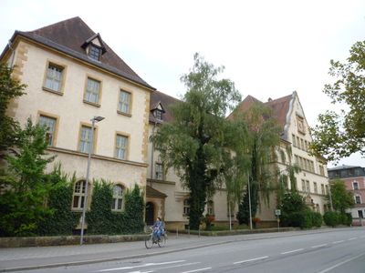 Berufsschule, mmächtiger dreigeschossiger Mehrflügelbau mit Walmdächern, mit Schweifgiebel und Rustikaportal, in reduzierten Formen der deutschen Renaissance, 1909