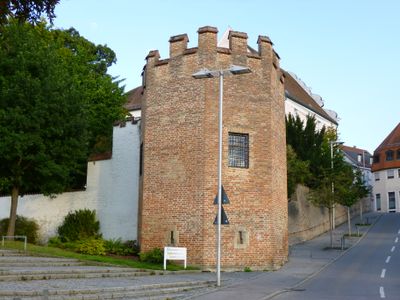Erster Bering der Befestigung unter Ausschluss der Nordwestecke der Stadt vor 1332 vollendet, ab 1447 Ausbau der Mauer, Anlage des Zwingers und der zweiten Mauer im Westen (nicht erhalten), Heranleitung der Donau durch die "Bschlacht"