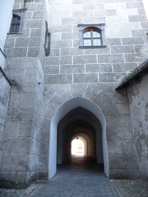 Toranlage, sogenanntes Unteres Tor, spätmittelalterlich, mit Zinnenkranz und Wappen des Kurfürsten Karl Theodor, im 17. Jahrhundert überbaut, 1752 wohl erneuert