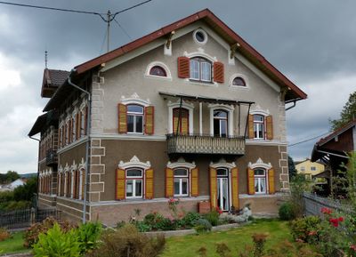 Ehemals Bauernhaus, jetzt Wohnhaus, zweigeschossiger Satteldachbau mit Kniestock, Zwerchhaus, historistische Fassadengestaltung, 1890