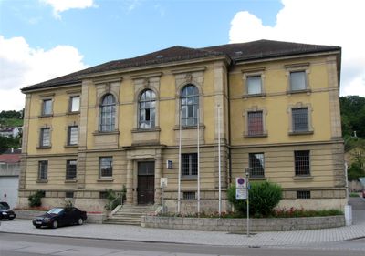 Justizvollzugsanstalt, ehemaliges Land- und Amtsgerichtsgefängnis, heute Justizvollzugsanstalt, Anlage über T-förmigem Grundriss, breitgelagerter dreigeschossiger Verwaltungsbau in neuklassizistischen Formen mit Mittelrisalit, rückwärtig langgestreckter Zellentrakt, H