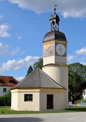 Uhrturm mit Brunnenhaus, zweite Hälfte 15. und 17. Jahrhundert. Die Besonderheit der Uhr ist, dass der große Zeiger die Stunden und der kleine Zeiger die Minuten angibt.
