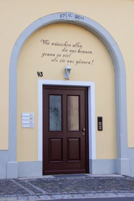 Rundbogiger Torbogen, teilweise zugemauert und mit einer Tür versehen, bezeichnet „1733“