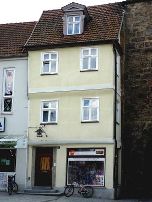 Satteldachhaus, dreigeschossig traufständig, verputztes Fachwerk, im Kern spätmittelalterlich, im Erdgeschoss moderner Ladeneinbau