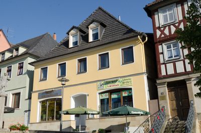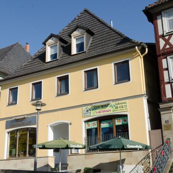 Walmdachgebäude, zweigeschossig, verputztes Fachwerkobergeschoss, im 18. Jahrhundert ausgebaut, im Erdgeschoss moderner Ladeneinbau