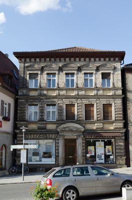 Walmdachhaus, dreigeschossig mit rustizierter Fassade, um 1900, im Erdgeschoss moderner Ladeneinbau