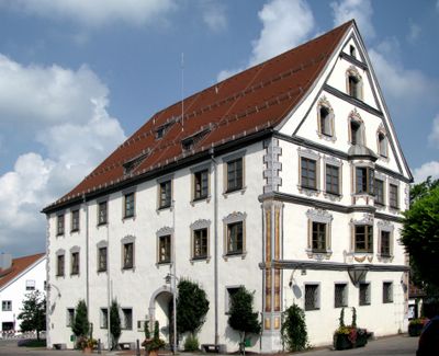 Schloss Obergünzburg, dreigeschossiger Satteldachbau mit Erker und Ladegaube, Westseite abgewalmt, 1570 als Korn- und Rathaus errichtet.